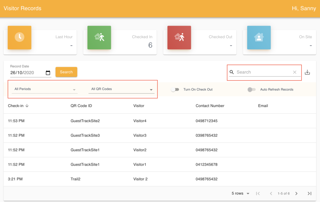You may apply filters to the table or search for particular records by visitor name, phone number, email and more.